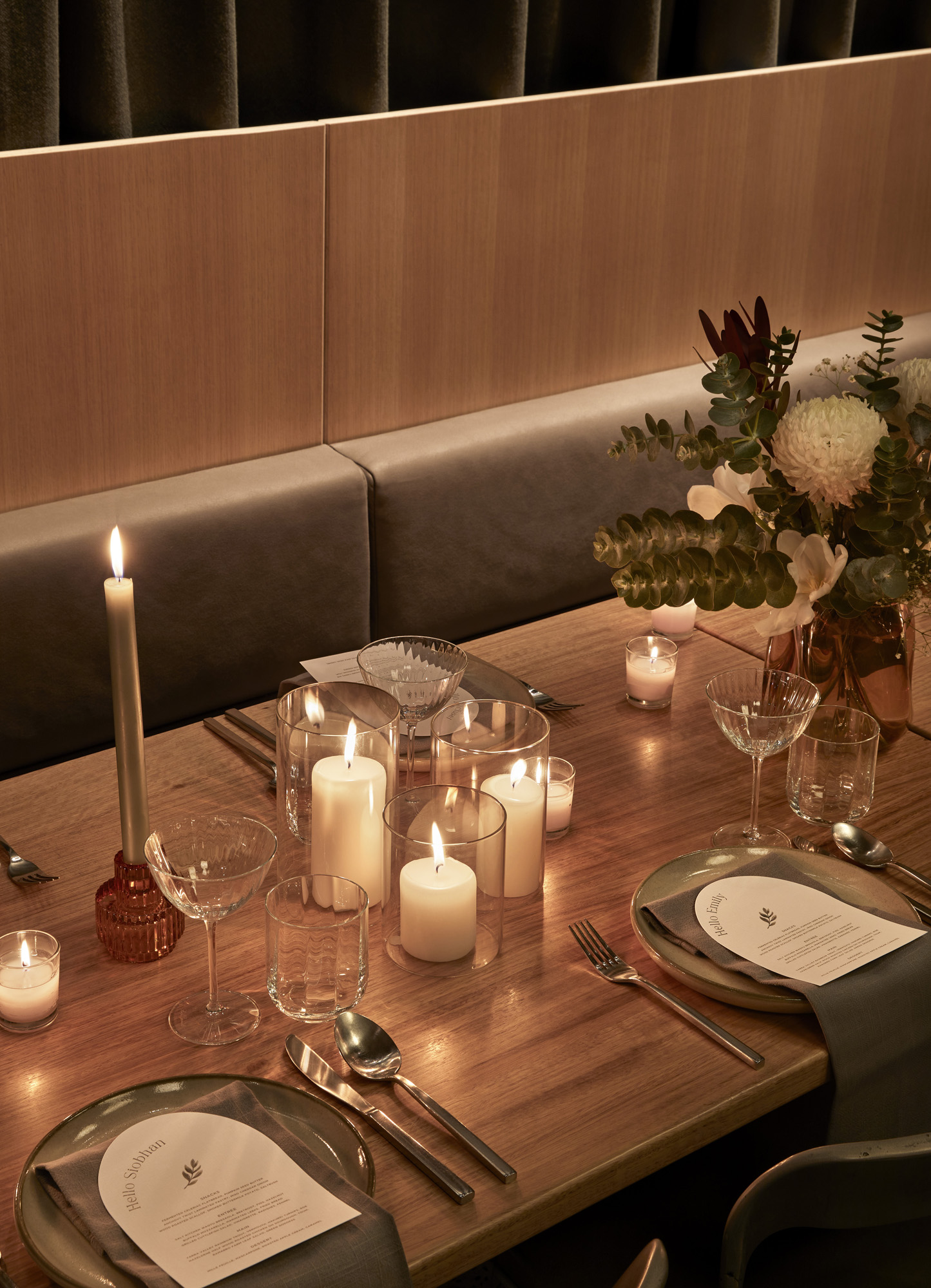Set in a cavernous space of warm Victorian Ash, honed concrete, leather furnishes and bronze fluted glass, our private dining space is a spectacular venue for events and private celebrations. Select from the private dining room - hidden away behind towering wooden doors, where feature lights inspired by soft clouds suspend overhead.
