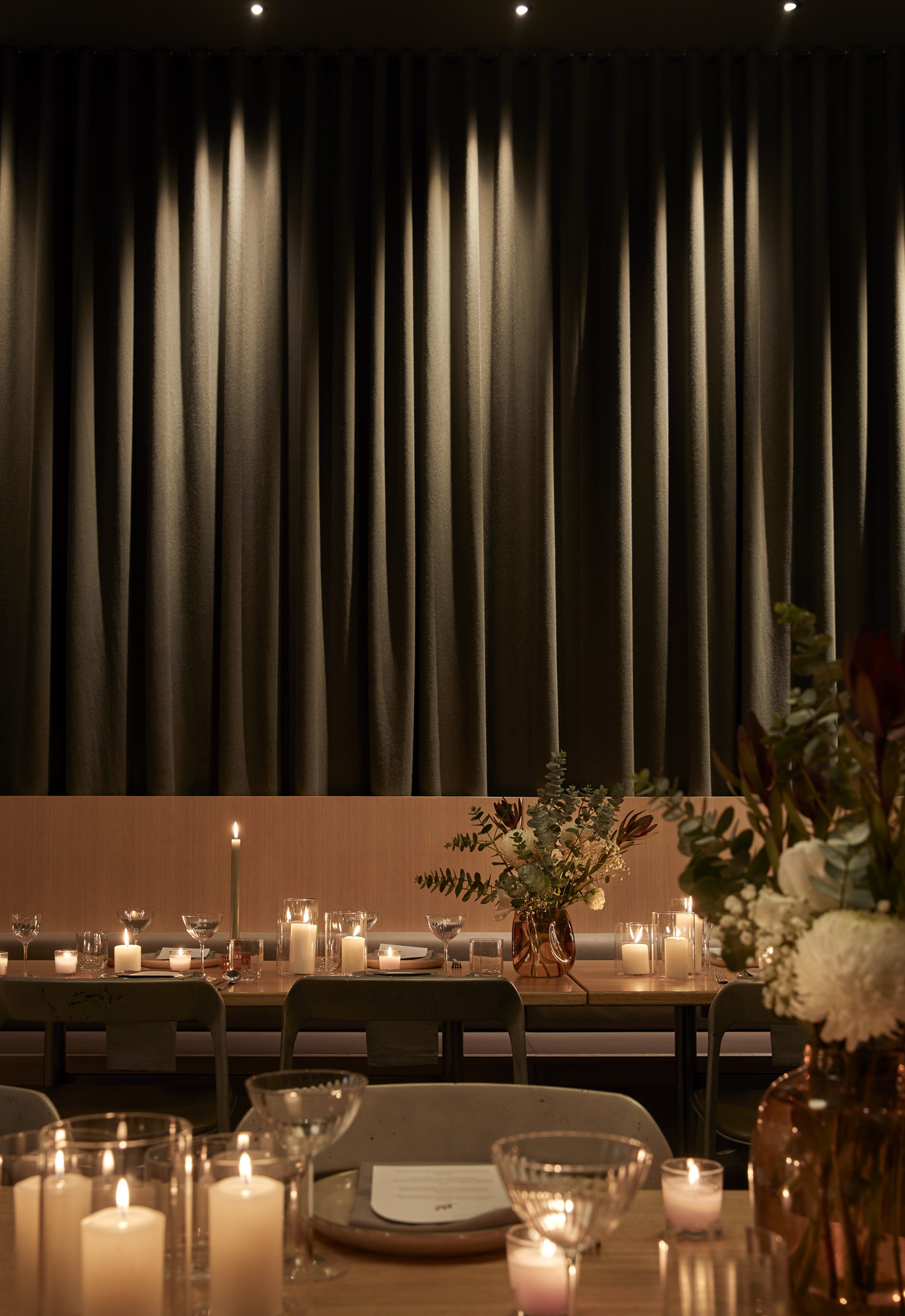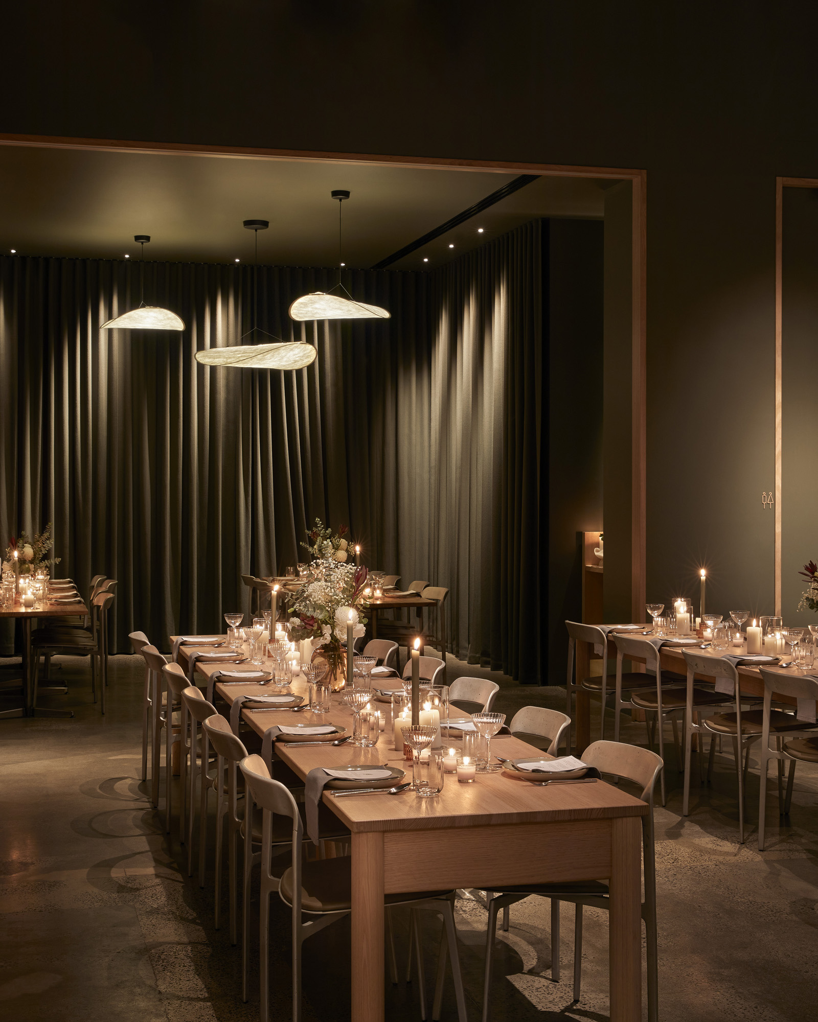 Set in a cavernous space of warm Victorian Ash, honed concrete, leather furnishes and bronze fluted glass, our private dining space is a spectacular venue for events and private celebrations. Select from the private dining room - hidden away behind towering wooden doors, where feature lights inspired by soft clouds suspend overhead.